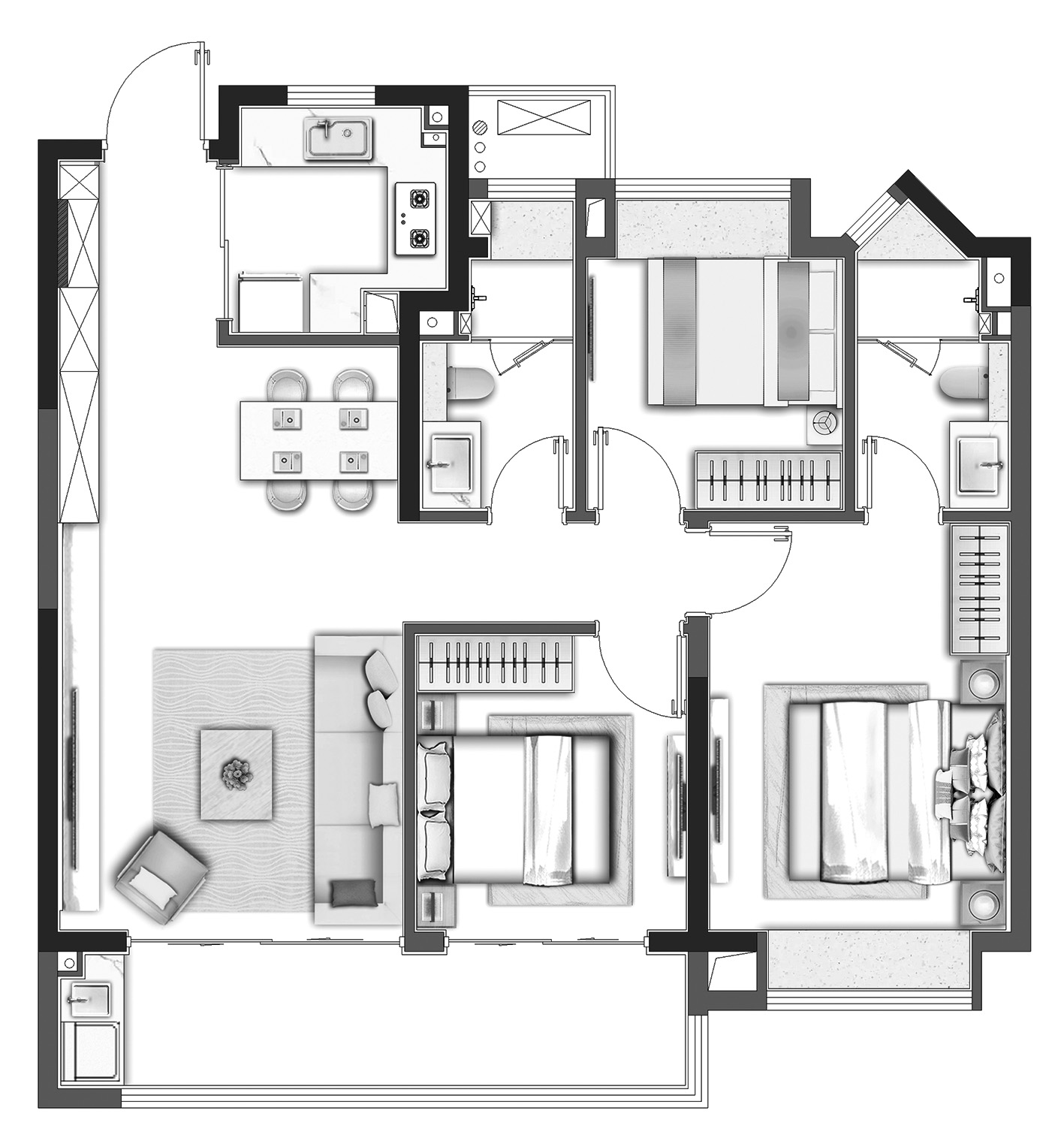 对空间的敏感上,招商蛇口不局限于此,由于关注到传统的刚需、刚改客群对客厅的需求越来越大,但随着时间的推移,对餐厅和次卧空间的需求又会尤为明显。正是前瞻到年轻化的需求,璀璨璟园将各个空间尺度进行均衡,给业主平等舒适的空间感。