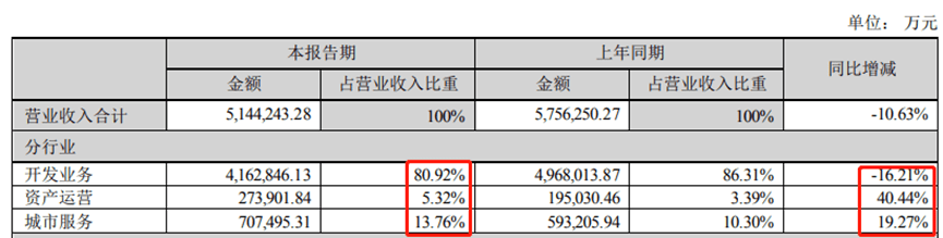 从营收来看,上半年三大业务中,除了开发业务同比下降16.21%,资产运营、城市服务业务均大幅增长。