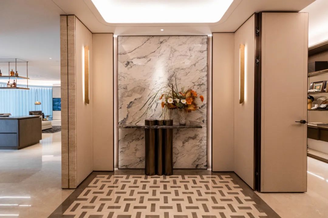 从地库大堂至首层大堂再到艺术电梯厅,设置了三进式归家礼遇,营造超五星级酒店般私密性与尊属感。层高约9米的首层大堂以柏悦酒店为设计灵感打造奢华酒店入户大堂,内设管家前台、咖啡吧、大堂吧等商务功能。首层配有12个候梯厅,分区分户归家礼遇;另外项目还配置双车库大堂,保证业主私密性。负二层公寓车库甄选环氧地坪漆地面,车道采用铝方通与木纹方通吊顶,延续室内奢华酒店装修风格。