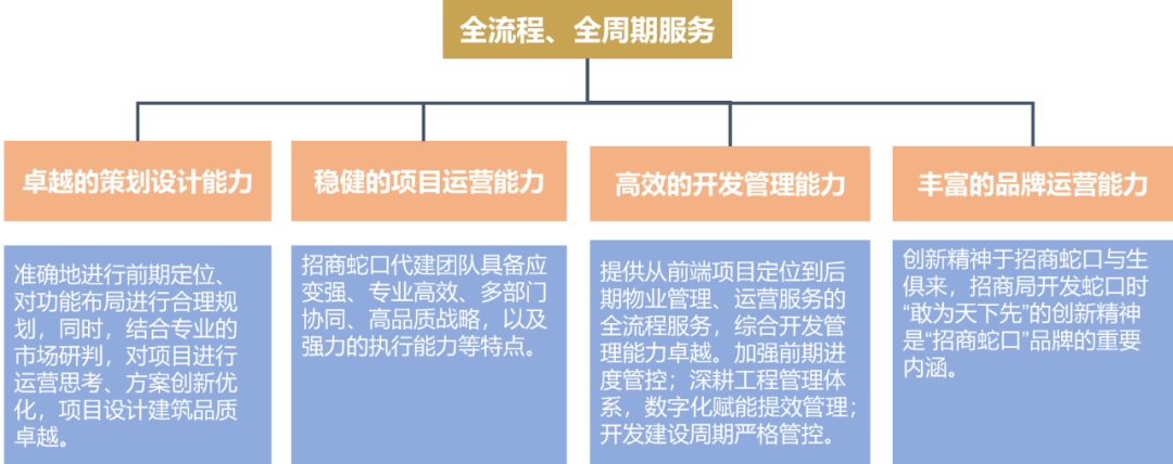 经过十余年的发展,招商蛇口凭借“开发建设、运营管理、资金运作、品牌运营”等方面的出色能力,通过成立专业化代建部门深度参与城市建设,为客户提供全流程、全周期服务。