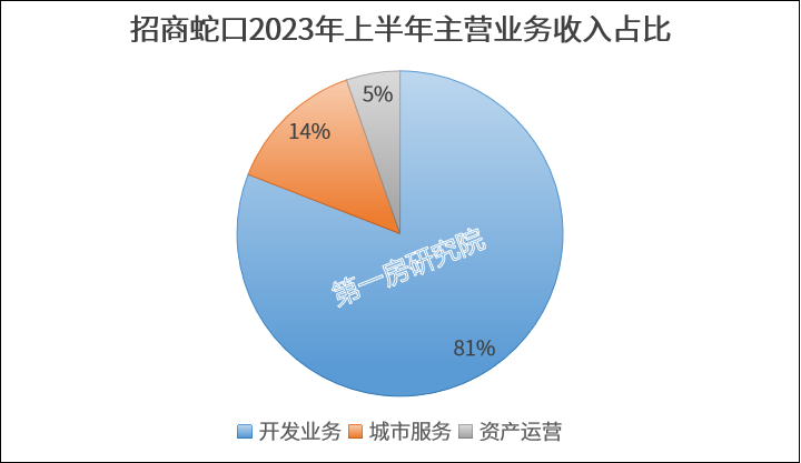 招商蛇口目前主要营收为三大业务模块,地产开发、城市服务、资产运营。根据招商蛇口2023年半年报显示,招商蛇口地产开发业务营收占比81%、城市服务业务营收占比14%、资产运营业务营收占比5%,业绩的背后是招商蛇口业务模式深化调整的结果。