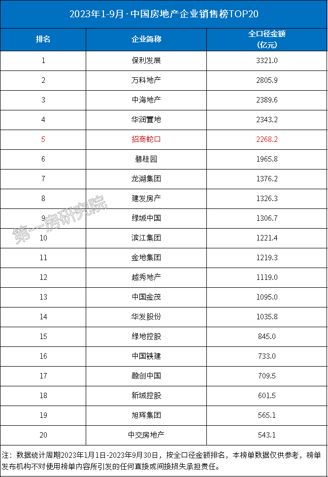 根据AI楼市大数据监测显示,2023年前三季度销售业绩过千亿的的房企14家,其中超2千亿的有5家房企,均为实力较强的国央企。大多曾经高周转企业均淡出“千亿俱乐部”名单,国央企霸榜。其中招商蛇口1-9月全口径销售金额2268.2亿元,位列第五,较2022年全年排名前移2个位次。在行业低迷的背景下,招商蛇口业绩表现依然亮眼。