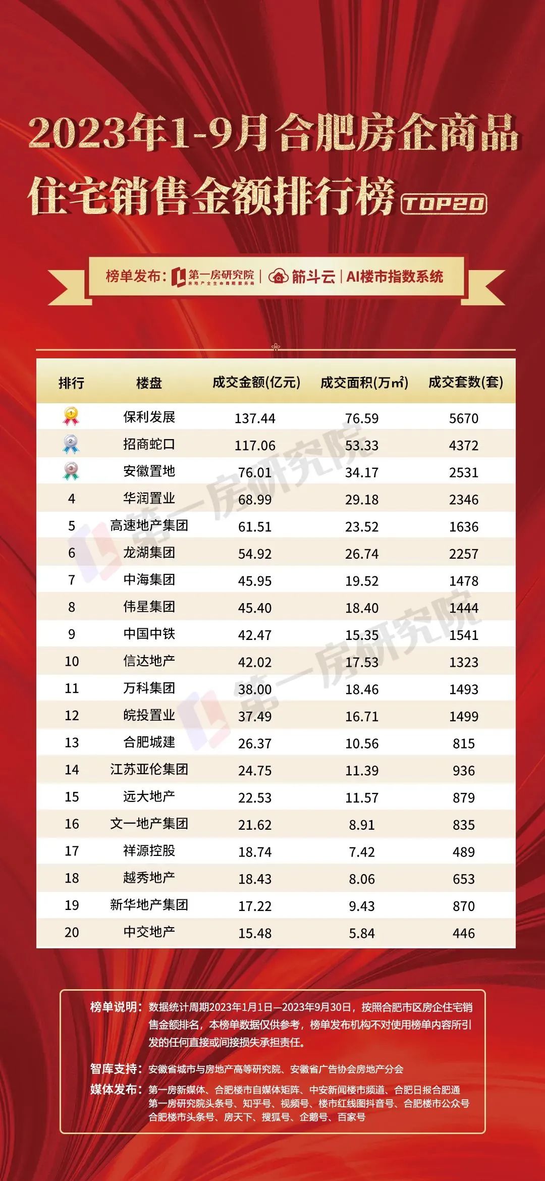 根据AI楼市大数据监测显示,2023年前三季度合肥TOP20房企累计销售932.4亿元,销售面积422.7㎡。国央企占12席,民营企业占8席,其中,安徽本土房企占8席。招商蛇口以销售金额117.06亿元,销售面积53.33万㎡,销售套数4372套的成为位列销售榜第二位。业绩主要贡献项目是璟园、招商保利臻悦以及招商奥体中心。近几年招商在合肥活跃度,无论是住宅板块,还是多元业态的规划建设,以品质社区、商务办公、产业园区、体育综合体等全维度覆盖。今年再布局蜀山和高新,在合肥不断深耕。