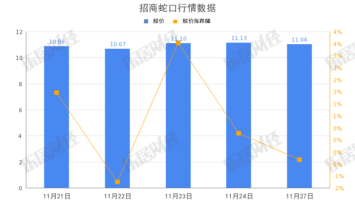 截至11月27日,招商蛇口(001979.SZ)股价收盘报11.13元,跌0.81%,总市值1,000.32亿元。