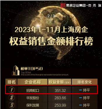 在克而瑞发布的上海房企前11月权益销售金额排行榜中,招商蛇口以351.32亿元占据榜首,领先第二名近70亿元,如无意外,它将坐稳全年的销冠。这将会是招商蛇口的一次蝉联,在2022年上海房企全口径金额、权益销售金额及操盘面积等排行榜中,招商蛇口就已经实现了登顶。