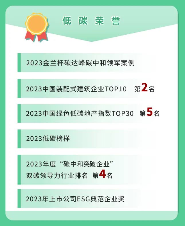 2023年,凭借在ESG方面的优异表现,招商蛇口MSCI ESG达到A级,为A股房地产上市公司MSCI ESG最高评级。《财经》杂志2023年房地产行业双碳领导力排行榜,招商蛇口位列第四名,比上一年排名上升10位,并获得“碳中和突破奖”。