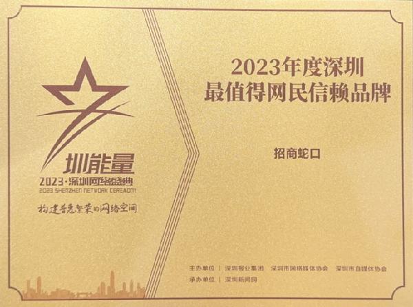 在第六届“圳能量”深圳网络盛典活动中,招商蛇口深圳公司荣获“2023年度深圳最值得网民信赖品牌”。本次活动由深圳市互联网行业联合会作为指导单位,深圳报业集团、深圳市网络媒体协会、深圳市自媒体协会主办,深圳新闻网承办,全面盘点深圳互联网行业一年来取得的新探索,并揭晓多个重磅奖项。