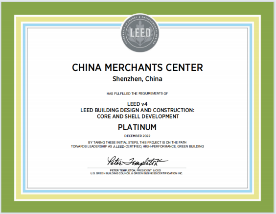 2023年,太子湾大厦项目荣获美国绿色建筑委员会(USGBC)颁发的LEED铂金级预认证标识证书,成为深圳市蛇口片区首个300m以上超高层建筑获得LEED铂金级预认证的建筑。