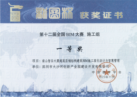 南山智谷大厦项目、宝安公共文化艺术中心项目分别获得第十二届“龙图杯”全国BIM大赛施工组一等奖、三等奖。“龙图杯”是国内规模最大的综合性BIM大赛之一,具有权威的专业影响力。此次获奖标志着项目在智慧建造方面实现新突破,对推广项目智慧建造技术成果,提高项目安全和质量管理在智慧建造领域核心竞争力具有重要意义。