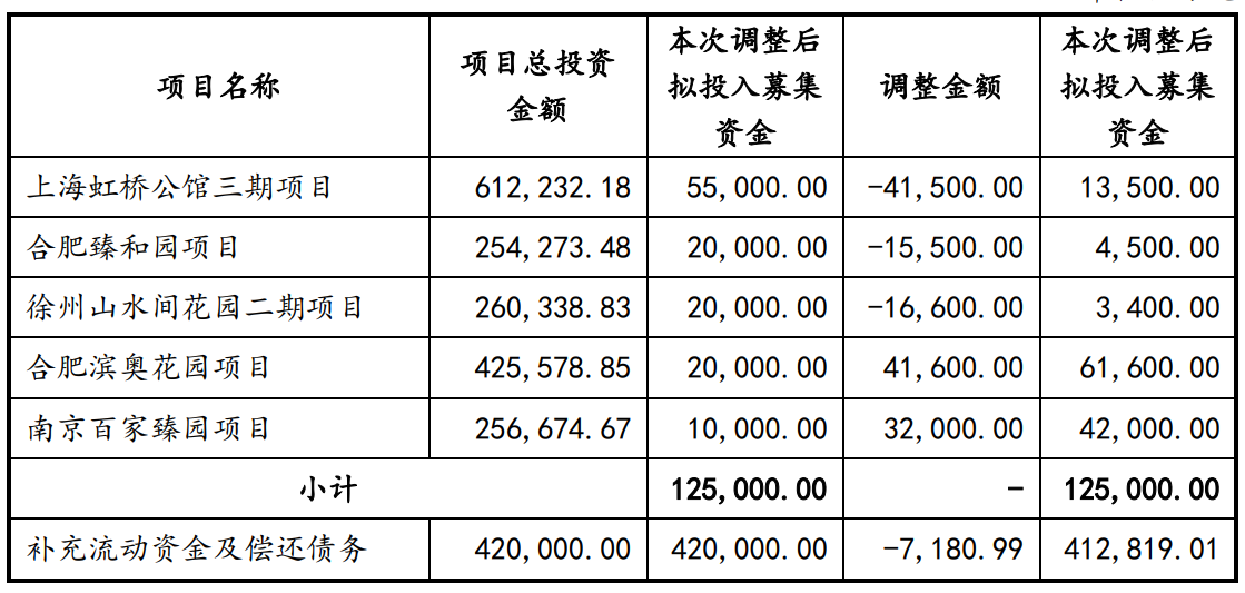 本次调整中,“合肥滨奥花园项目”、“南京百家臻园项目”拟增加投入募集资金41,600.00万元、32,000.00万元,主要用于项目建安成本;“上海虹桥公馆三期项目”、“合肥臻和园项目”及“徐州山水间花园二期项目”拟投入募集资金分别减少41,500.00万元、15,500.00万元及16,600.00万元,后续公司将根据项目实际需要以自筹资金和自有资金投入予以解决。