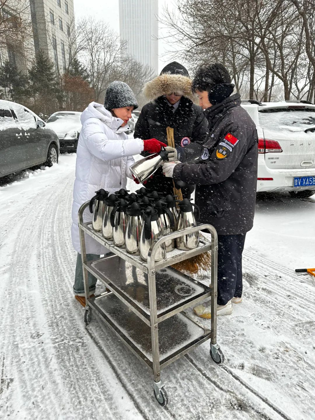 招商积余物业管理中心保障不停,关怀不停,帮助抛锚业主推车、护送客户上下班、为业主准备驱寒热饮、自制“去冰神器”为业主车辆除冰、清除车辆积雪、为风雪中的业主递上一把伞、送上暖宝宝……遇见冰雪遇见爱,服务业主换舒心。