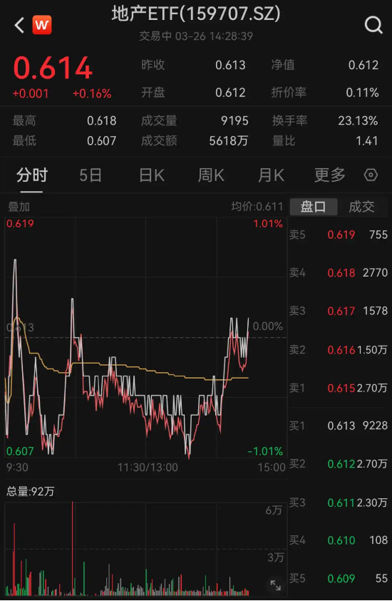 3月26日,地产板块反复活跃,龙头地产韧性凸显。截至发稿,招商蛇口涨超3%,滨江集团、万科A涨逾1%,代表A股龙头地产行情的地产ETF(159707)午后再度翻红,盘中溢价走阔,实时成交额突破5600万元,换手率超23%。