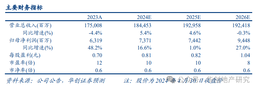 投资建议:公司高能级城市布局支撑销售兑现,2022年以来逆势扩表及核心城市深耕优势,随着滞重土储的不断消化,预计招商蛇口将是首批走出利润率下滑的公司之一。考虑公司减值压力降低,毛利率稳定,我们预测2024-2026年公司eps分别为0.81、0.82、1.04元,考虑到公司作为头部国央企的中长期价值,以及实施“一城一模板”后带来运营效率提升,基于剩余收益模型,给予2024年目标价14元,对应2024年17倍PE,维持“推荐”评级。