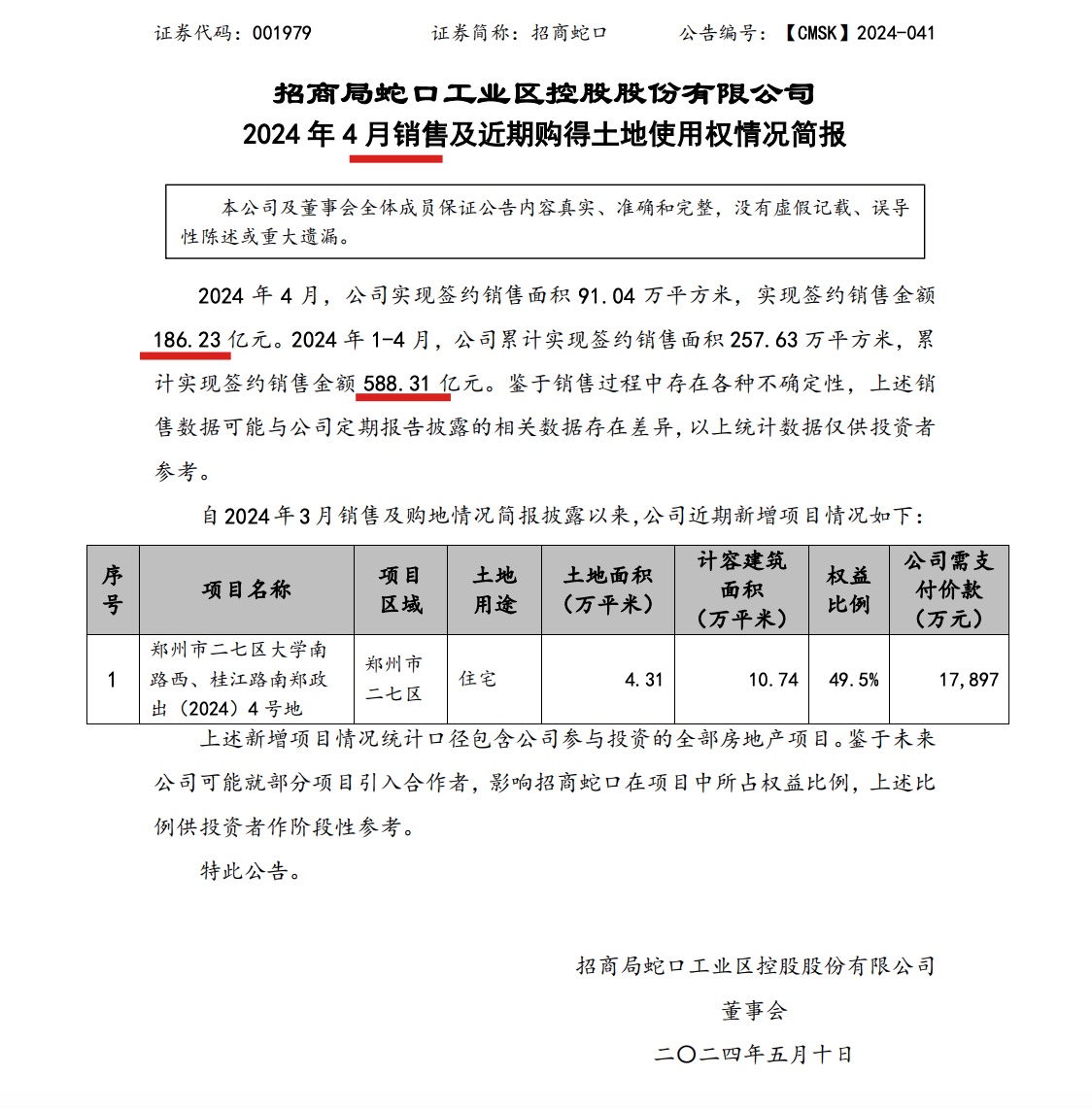 5月10日讯,招商局蛇口工业区控股股份有限公司(招商蛇口,001979.SZ)公布了其2024年4月的销售业绩。