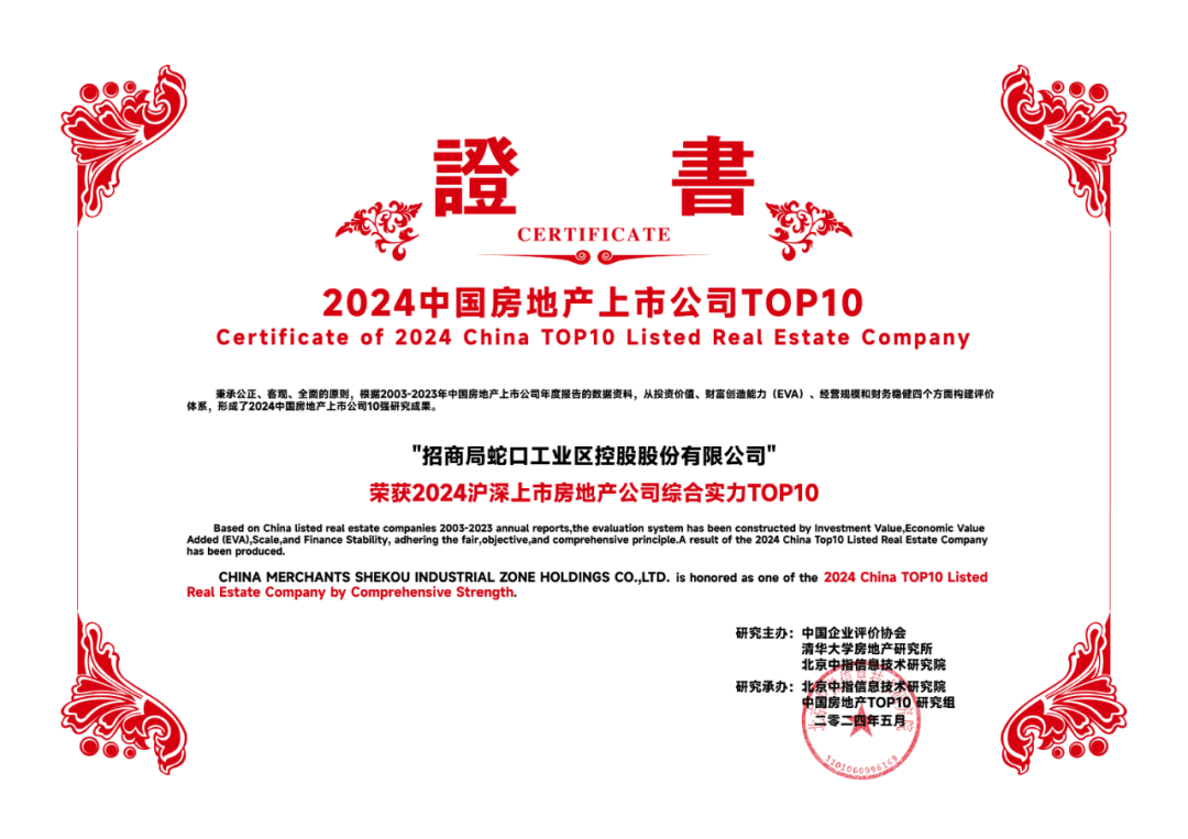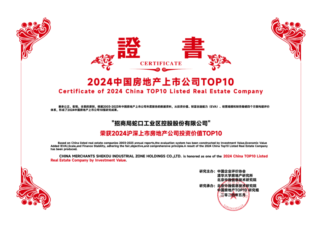 凭借强大的综合实力和突出的业绩表现,招商蛇口荣获“2024沪深上市房地产公司综合实力TOP10”、“2024沪深上市房地产公司财富创造能力TOP10”、“2024沪深上市房地产公司财务稳健性TOP10”、“2024沪深上市房地产公司投资价值TOP10”等多项殊荣。