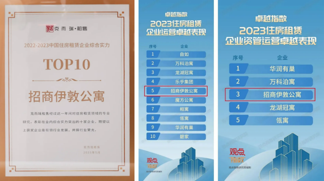 凭借管理实力、运营能力和产品品质等优势,招商伊敦荣获“2023住房租赁企业运营卓越表现”“2023中国房地产住房租赁运营优秀企业”“2022-2023住房租赁企业综合实力TOP10”“2023年度影响力·住房租赁运营服务十强”“中指研究院·中国住房租赁资产管理优秀企业第一名”等行业广泛认可奖项。