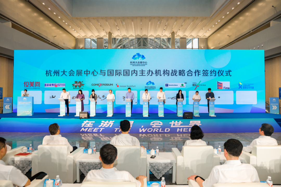 开展仪式上,朱党其宣布大会展中心启用暨首测展开展。现场,杭州大会展中心与德国法兰克福展览、德国汉诺威米兰展览、法国高美艾博展览集团、意大利艾意吉展览、上海摩都文化、杭州飞马、西安蓝装丝路、珠海星锋文化、仪美尚(上海)等9家国内外会展企业签订战略合作协议。