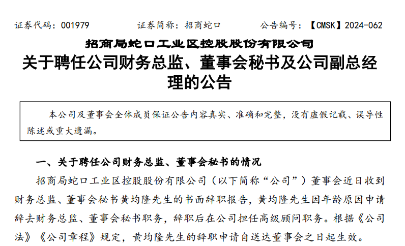 公告称,招商蛇口董事会近日收到财务总监、董事会秘书黄均隆的书面辞职报告,由于年龄原因,黄均隆申请辞去上述职务,辞职后将在招商蛇口担任高级顾问职务。