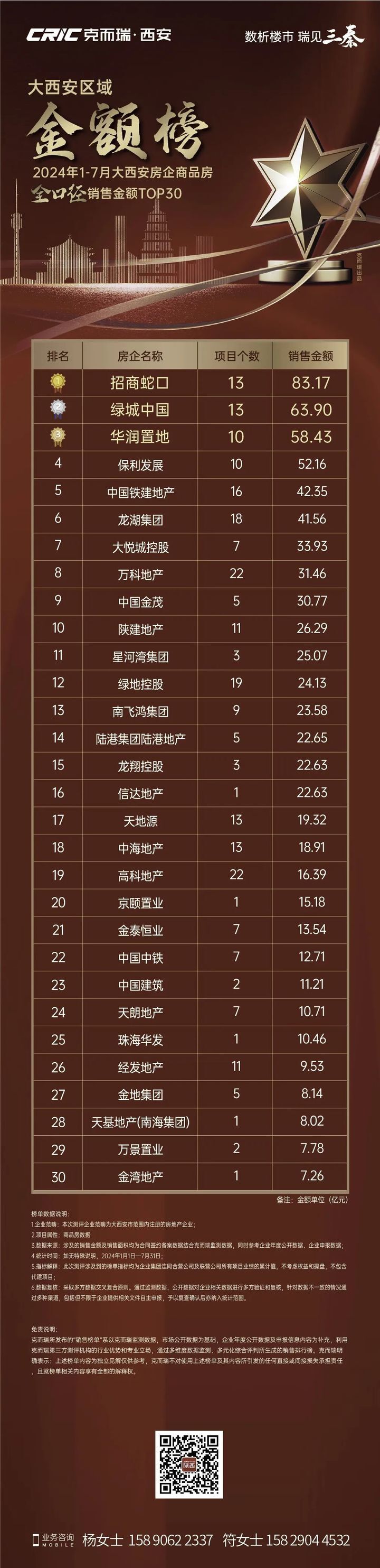 8月7日,克而瑞发布《大西安房企商品房全口径销售金额TOP30》,2024年1-7月大西安房企商品房全口径销售金额TOP30累计成交金额773.84亿元,较1-6月增加117.17亿元,7月增量与6月增量相比基本持平。成交面积382.62万㎡,较1-6月增加56.86万㎡,单月增量略有下滑。