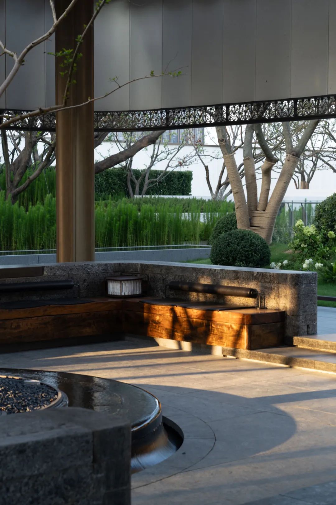 园区里的露天亭子,像是另一顶华盖,用静谧的光芒笼罩着每一个在树下聊天的人。围合式的座位,专门挑选了老木头,你可以触摸到岁月的质感;来自欧洲的宇宙星云石,会闪出谦逊的亮光。等到明年夏天,这株紫薇树会开出一树繁花。