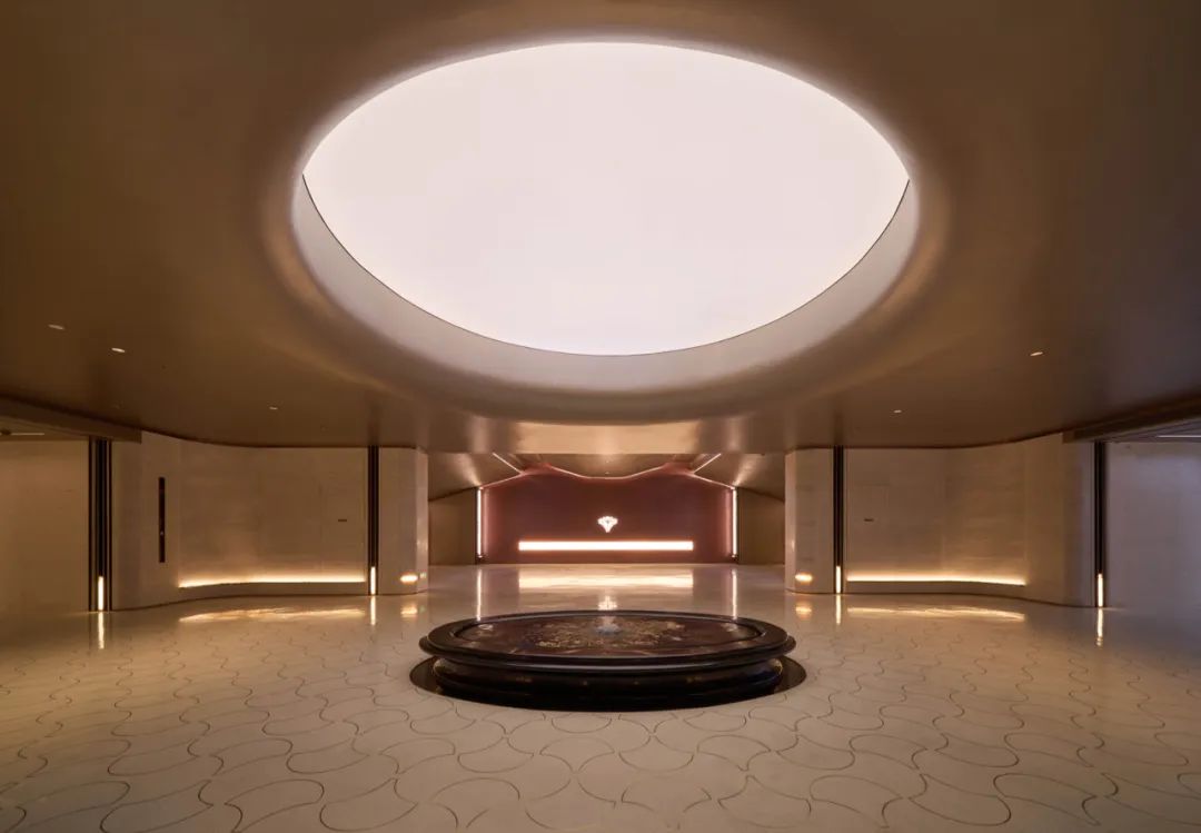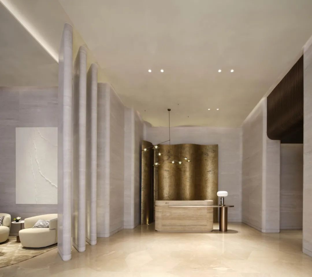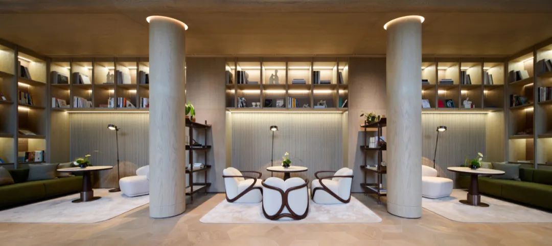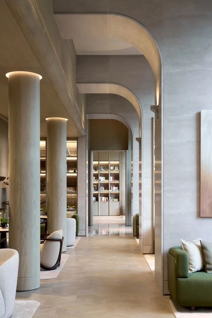 「既奢且隐」,还体现在对石材使用的克制。「招商玺」地下会所的墙上,铺了一共700多吨的意大利米白洞石,他们还把厚重的洞石像编磬一样镶嵌在整条走道上,地面通铺的是同样很贵的云白石。