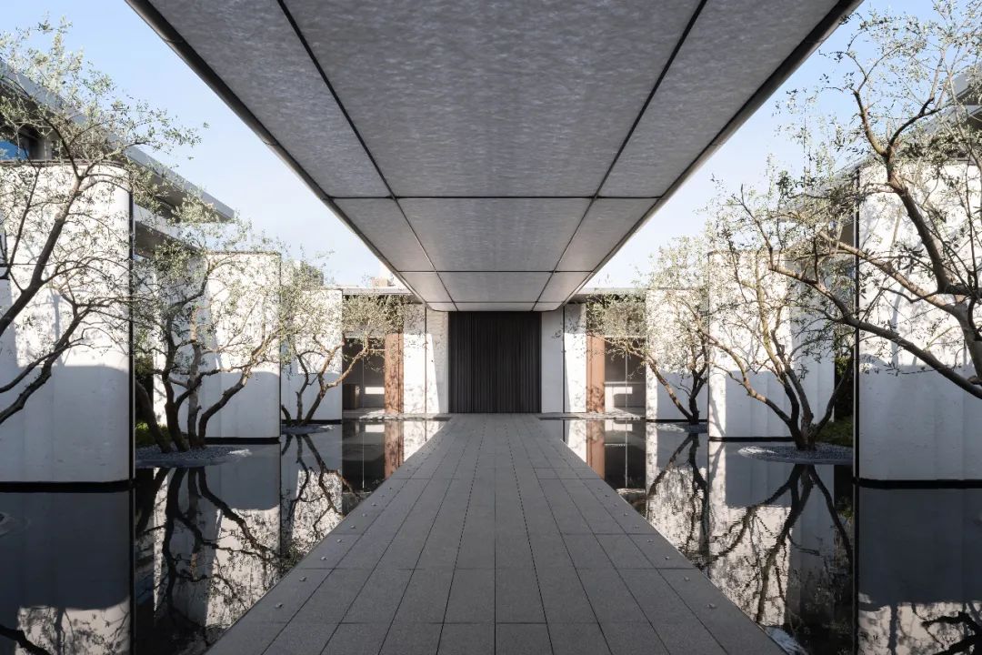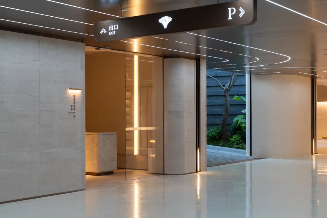 上楼之后,是另一个秘境。「招商玺」是基座抬高设计,约4米的高差带来了酒店一般的「空中大堂」;上楼之后的入口大堂,其实是在楼盘内部的地面层。归家长廊像是浮漂在水上的T台,两侧的油橄榄则是观众,欣赏你归家的每一步。进入这道门,就是可以俯视下沉式庭院的地面大堂。