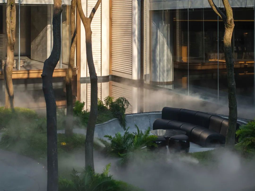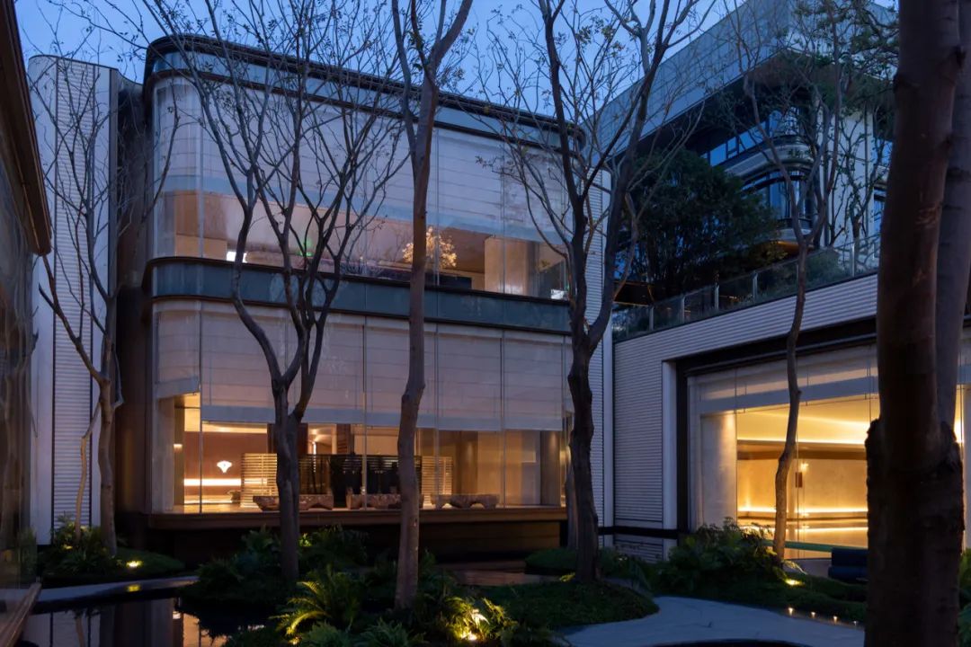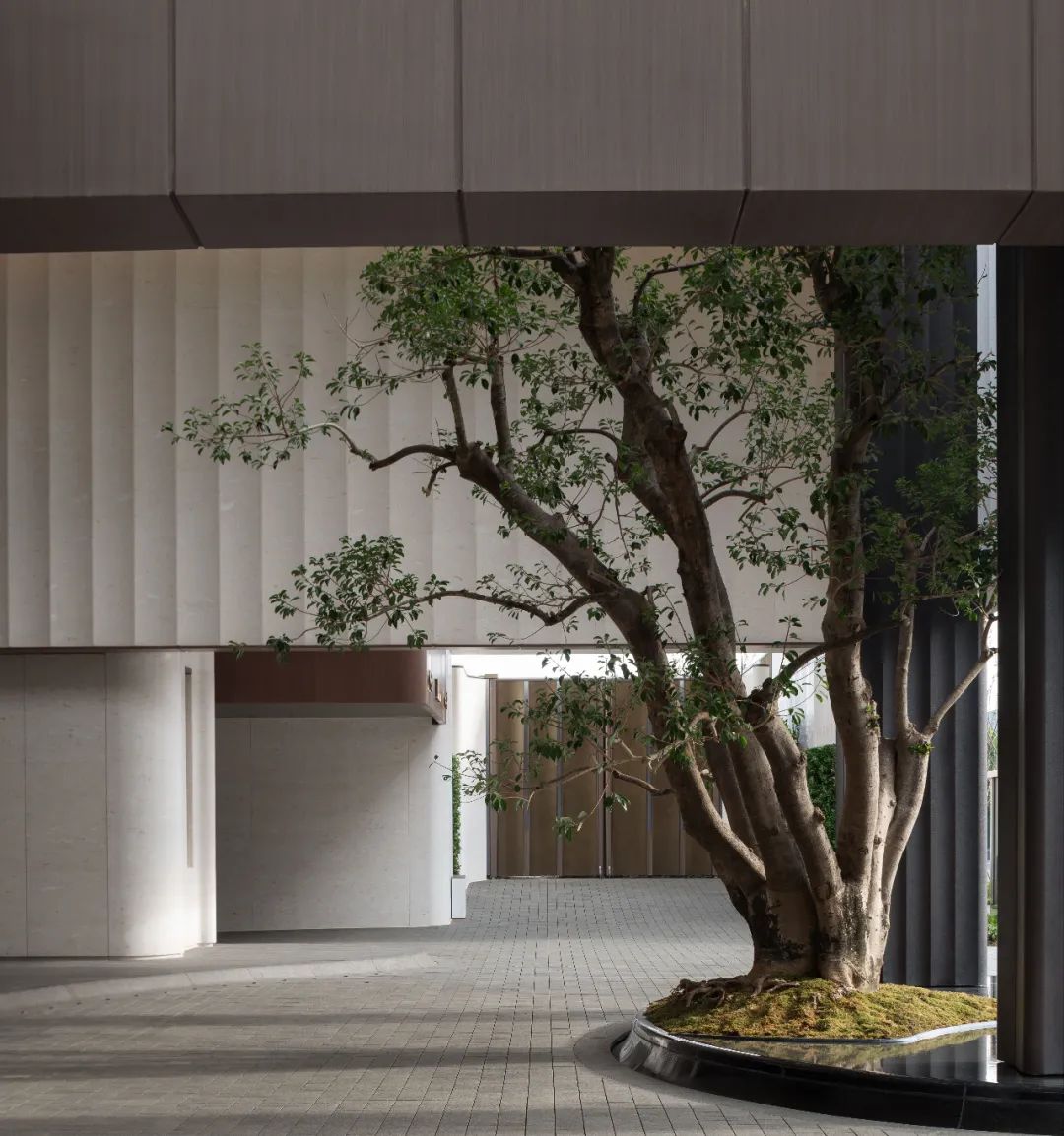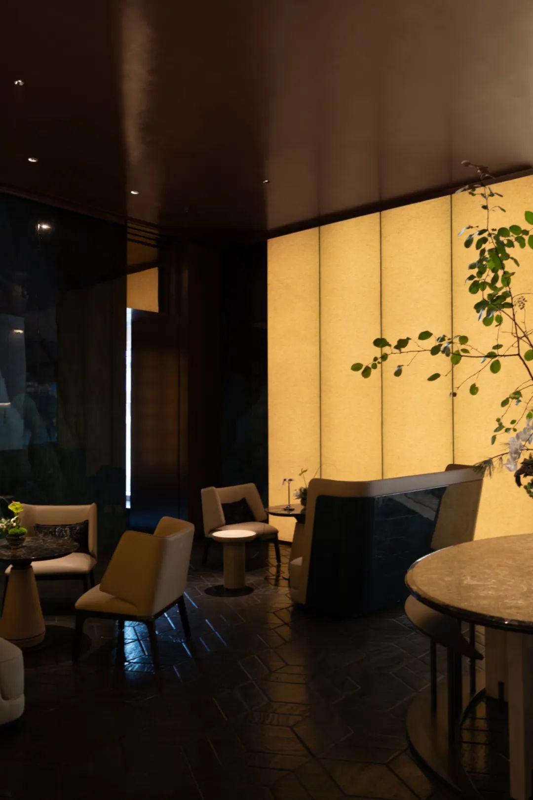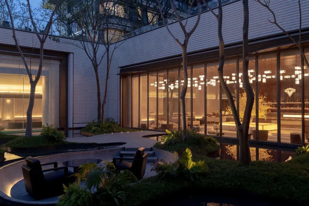 下沉式庭院里的树种得非常密,只要走三五步就有一棵树,它们会汇成一片浓密的森林。坐在庭院里,那些会所空间就像画舫一般停在水边,环绕着你的,是庭院里的微风习习和行政酒廊里的星光点点。