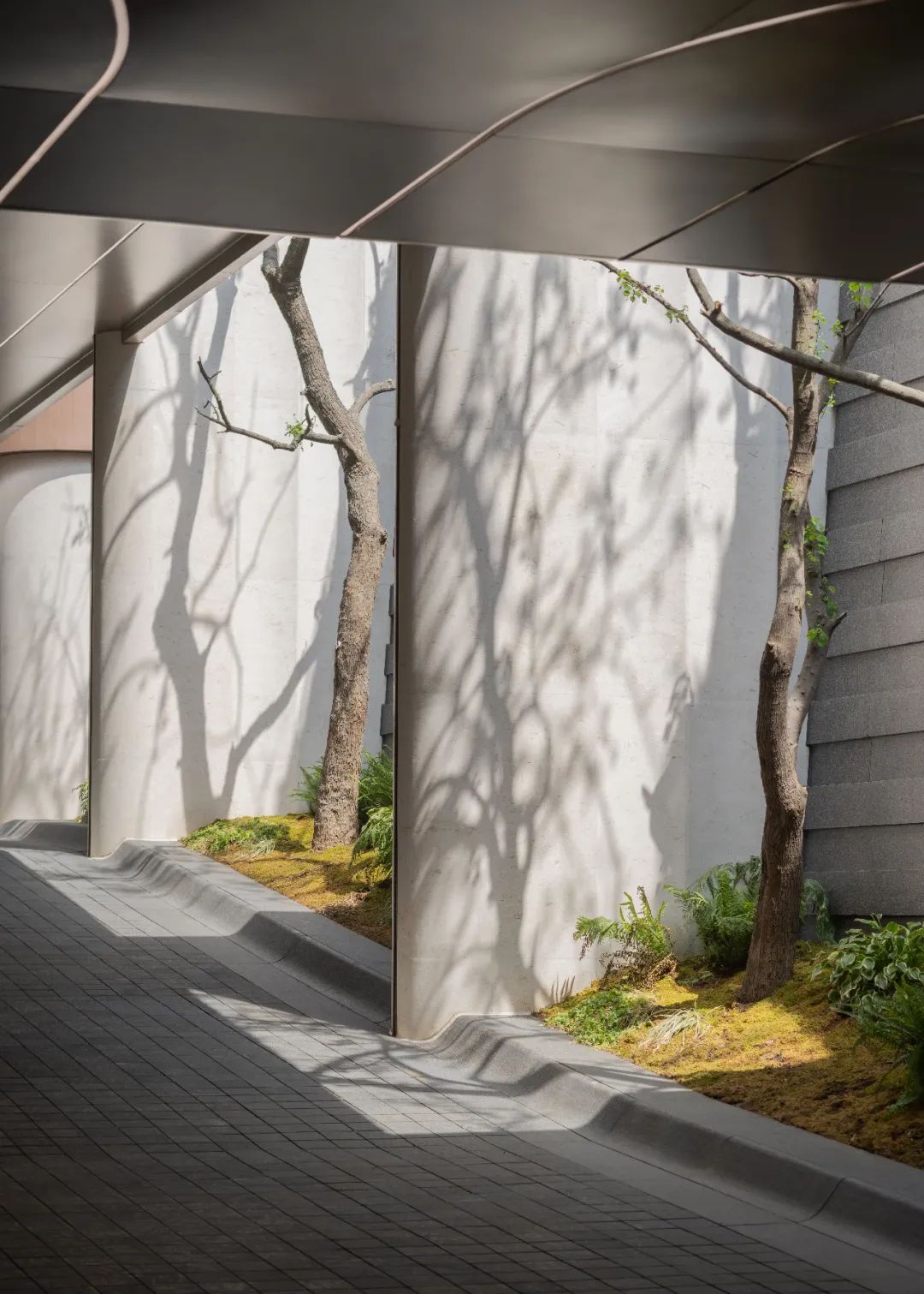 ●无处不在的「室内外交融」:地库坡道也有行道树及其天光树影;