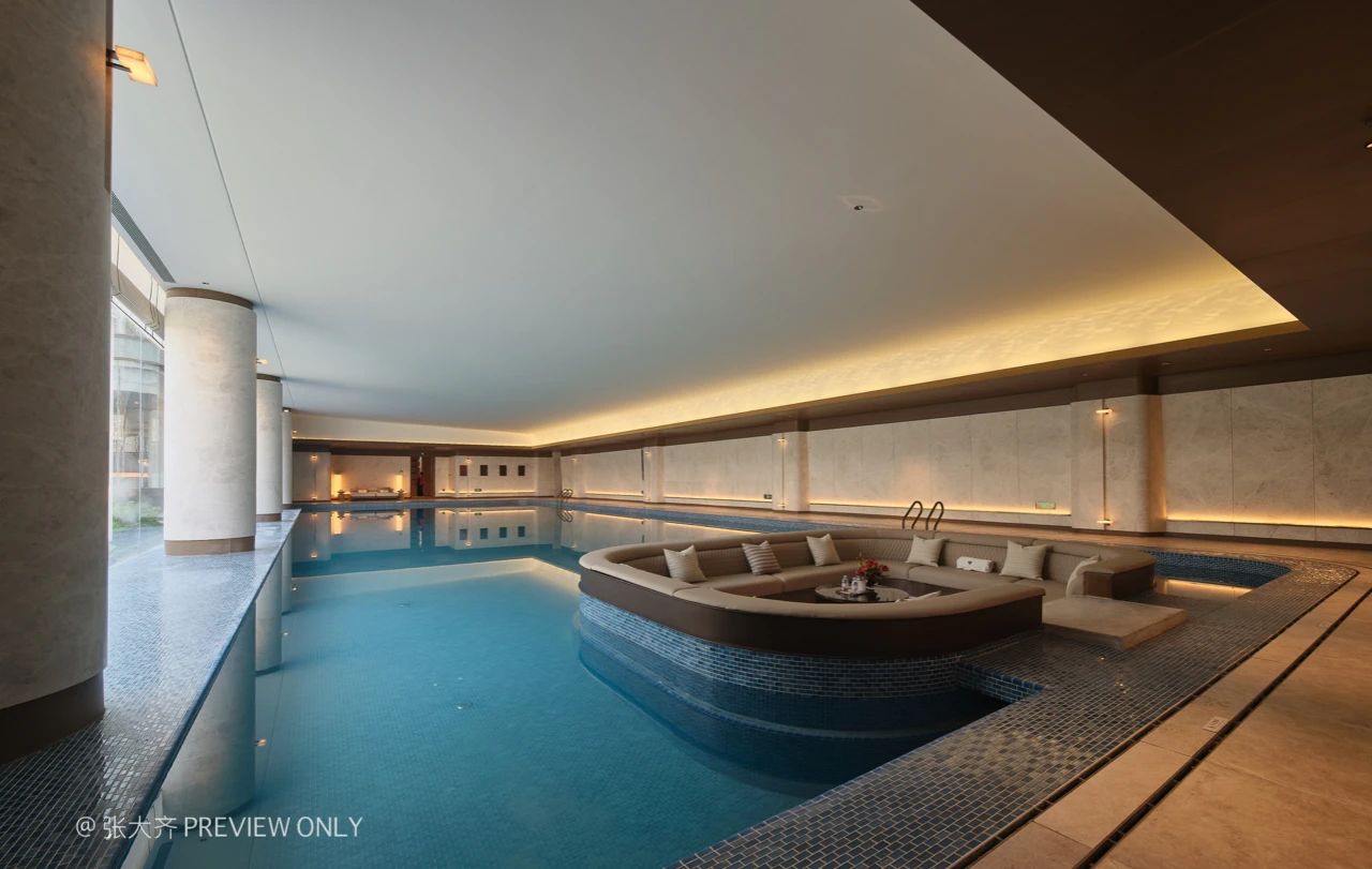哪怕是泳池,也要给它一个很有包围感的「小尺度空间」。为了给居家生活带去「度假感」,通常的做法是在室内恒温泳池的浅水区摆上一排水中躺椅,这当然也是很好的做法,但真实的使用频率非常低。「招商玺」的做法是,在泳池中嵌入一个漂浮的水上吧台,使用频率更高,场景浓度更丰富。哪怕只是陪着家属或者小朋友来泳池,哪怕不下水,你也可以坐在这里,让陪伴更优雅。
