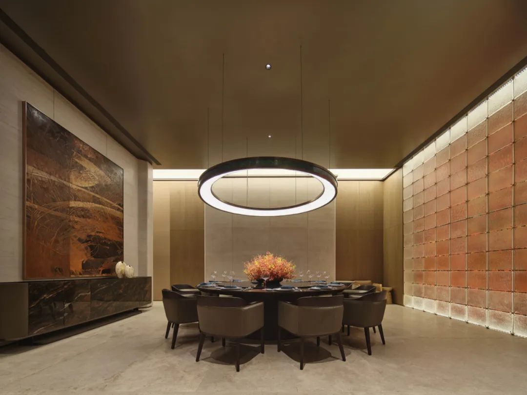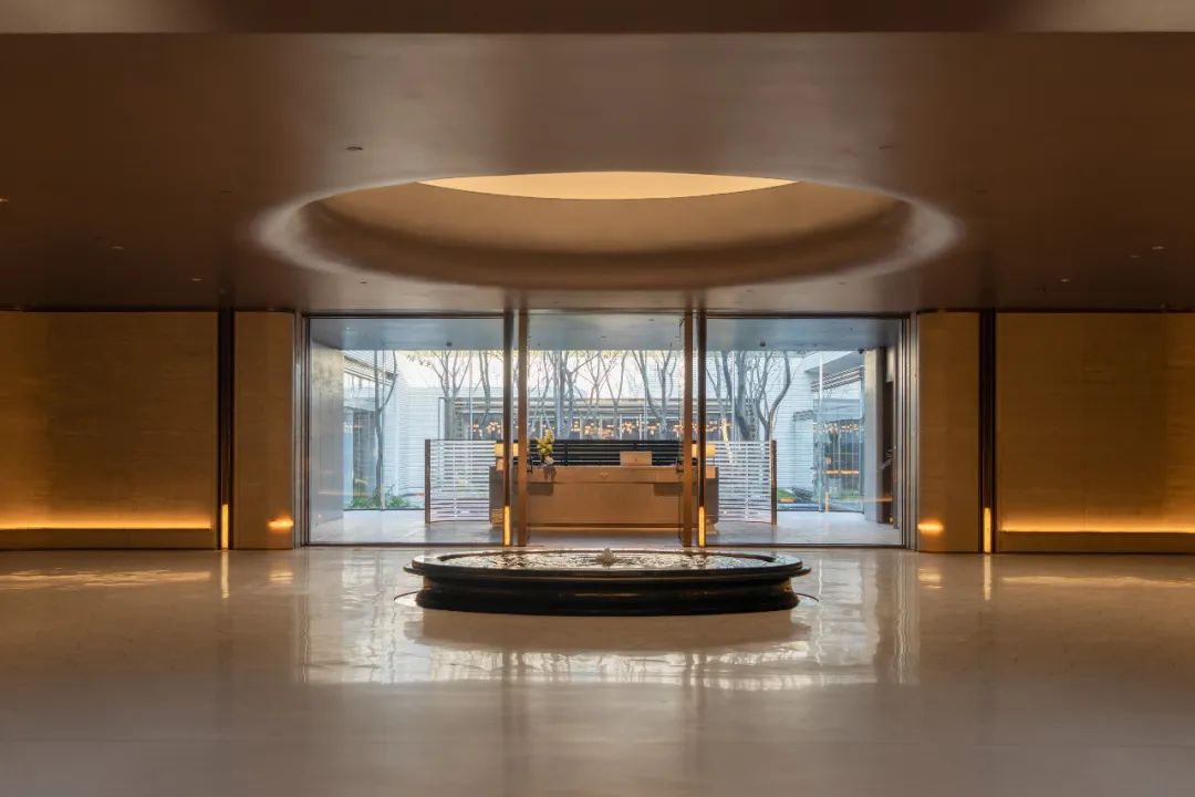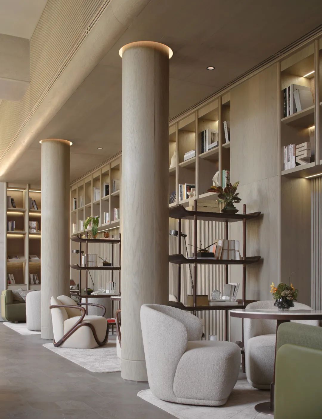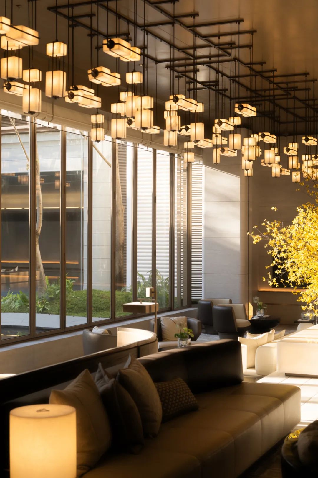 门口的「冬青华盖」是温柔环绕,景观中的「紫薇华盖」也是温柔环绕;会所大堂的行政酒廊有很宽敞的尺度,他们还在大幅玻璃窗前设计了很有包裹性的沙发区。