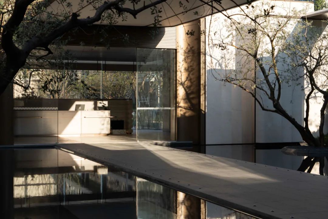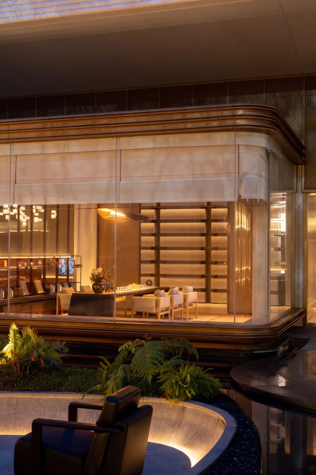 环绕着下沉式庭院的地下会所空间,当然也是「室内外交融」。走廊上的每一个包厢,都对着下沉式庭院的水光树影;行政酒廊的一排折叠窗可以完全打开,让行政酒廊与下沉式庭院直接交融在一起。