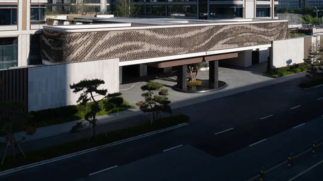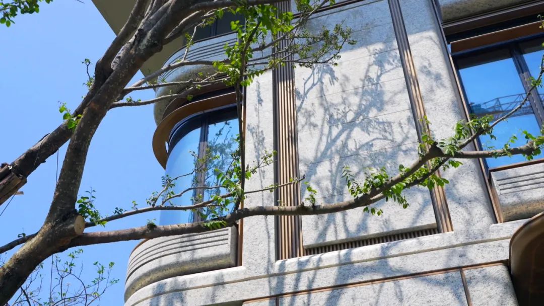 建筑立面用的是白世贸石材:圆弧切割的石材,带来了古典意味的横向线条,一看就知道这是贵重资产。通常,楼盘的北立面不怎么被重视,「招商玺」的南北立面则是几乎无差别的考究,用两种不同石材拼接出复杂而协调的纹路肌理。这样的温润材料和美学工艺,是建筑的无声之语。