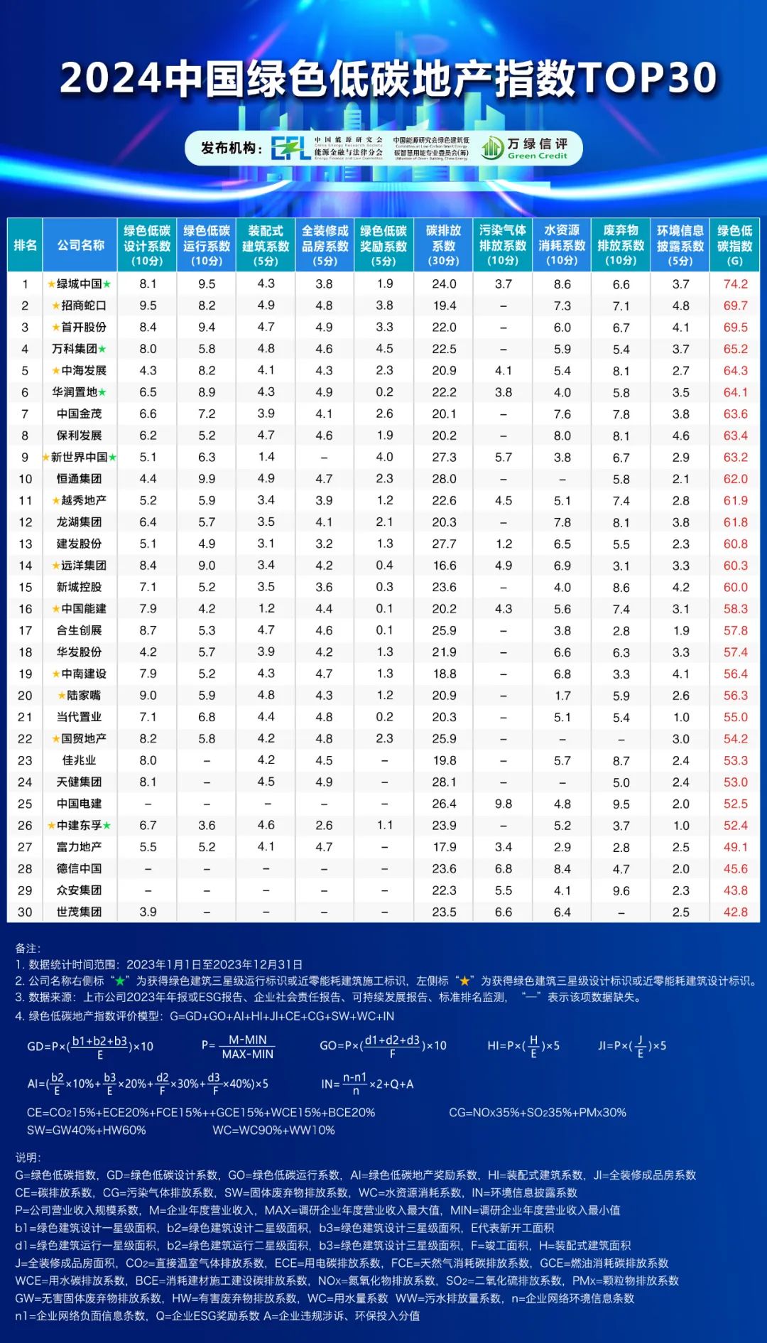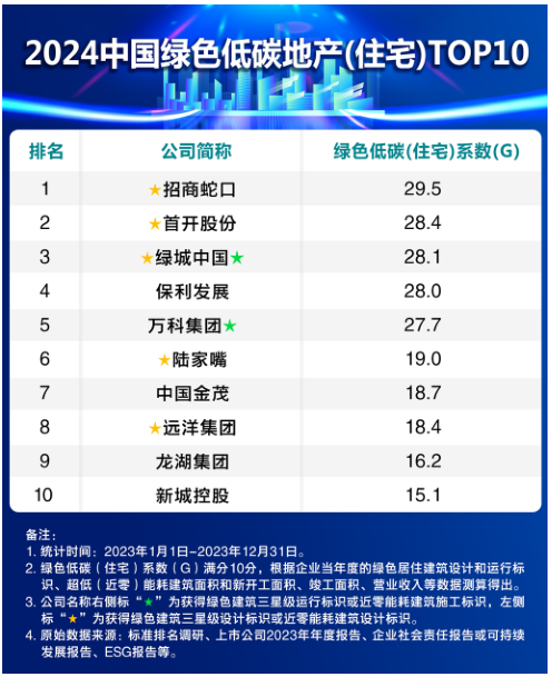 根据各家企业2023年度住宅项目获得绿色建筑设计和运行认证、超低(近零)能耗建筑面积以及新开工、竣工面积相关数据,测算出各家企业的绿色低碳地产(住宅)指数,其中招商蛇口、首开股份、绿城中国、保利发展、万科集团、陆家嘴、中国金茂、远洋集团、龙湖集团和新城控股跻身2024中国绿色低碳地产(住宅)TOP10。