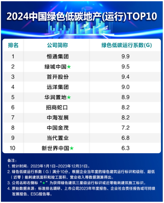首开股份、中海发展连续6年上榜,金融街控股、中建东孚、万科集团、旭辉控股和保利发展由2023年的前十跌出榜单;而远洋集团、华润置地和招商蛇口则因绿色低碳运行状况较好入选。