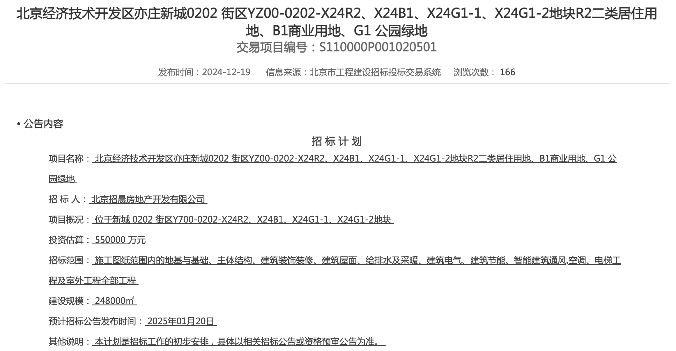 12月19日,在北京经济技术开发区亦庄新城0202街区YZ00-0202-X24R2、X24B1、X24G1-1、X24G1-2地块正式挂牌的第3天,招商蛇口旗下北京招晨房地产开发有限公司发出招标计划。