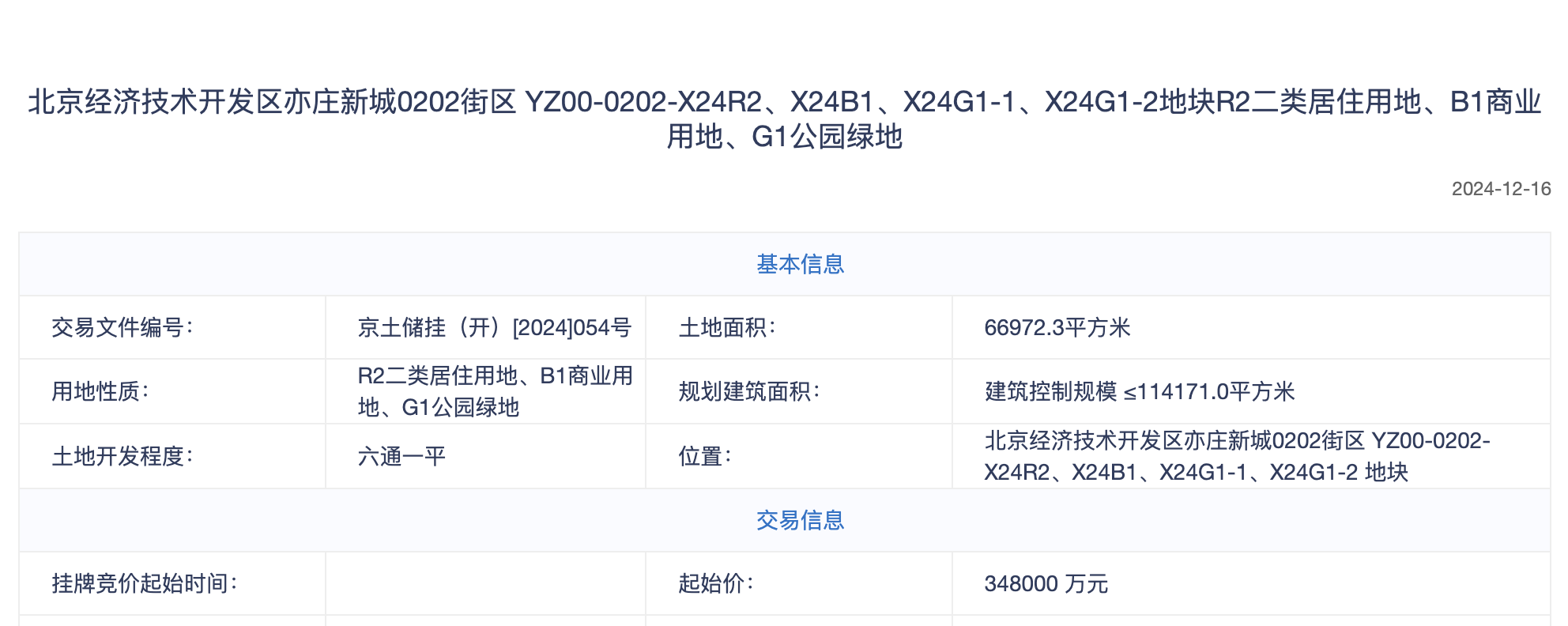 12月16日,该地块正式挂牌,交易起始价34.8亿元,未设上限价,挂牌竞价时间自2025年1月6日起至1月20日止。