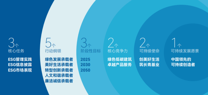 招商蛇口可持续发展(ESG)战略以“中国领先的可持续价值创造者”为愿景、以“创美好生活、筑长青基业”为使命,打造“绿色低碳建筑”和“卓越产品服务”两个可持续发展核心竞争力,根据“2025-2030-2050”三个阶段性目标,通过“绿色发展承载者”“美好生活承载者”“转型创新承载者”“人文和谐承载者”“廉洁诚信承载者”五大行动纲领,推动实施“ESG管理实践”“ESG信息披露”“ESG市场表现”三项核心任务。
