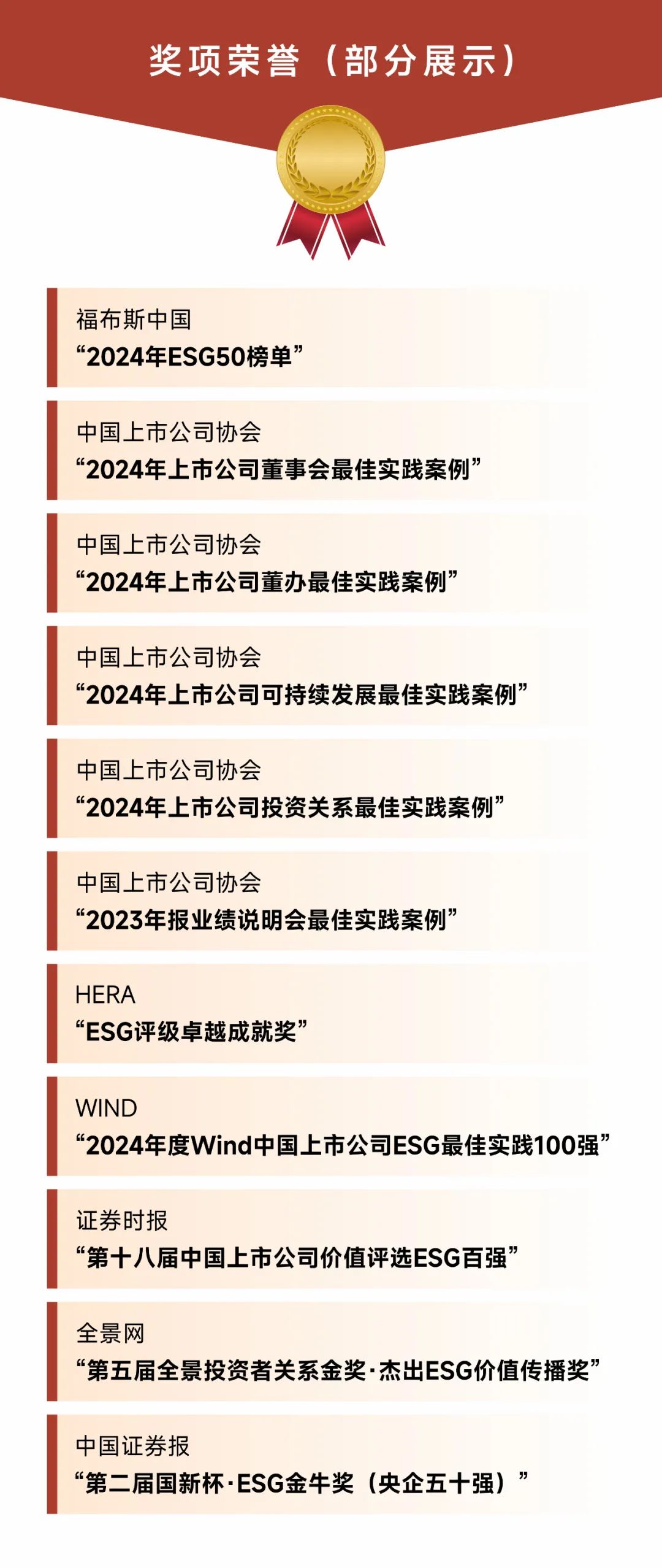 招商蛇口以“ESG管理实践”“ESG信息披露”和“ESG市场表现”为三大核心任务,持续夯实公司的ESG议题管理能力,优化ESG信息披露矩阵,积极提升ESG市场表现。2024年,公司可持续发展表现获得国际组织、上市公司协会、评级机构、主流媒体等市场参与方的广泛认可,荣获多项殊荣。