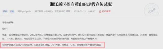 去年3月,位于长沙湘江新区的招商麓山府就有业主投诉其“虚假宣传减配”,称合同明确3500元/㎡的装修,实际上货不对板,比如入户大堂,电梯室,公区,房屋精装修严重缩水减配。随后,当地相关部门督促招商按要求整改。