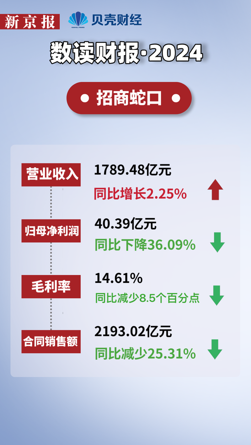 年报显示,2024年,招商蛇口营业收入1789.48亿元,同比增长2.25%;实现归母净利润40.39亿元,同比下降36.09%;扣非归母净利润约为24.49亿元,同比下降57.27%。营收实现小幅微增,但利润却出现大幅下滑,表现为“增收不增利”。