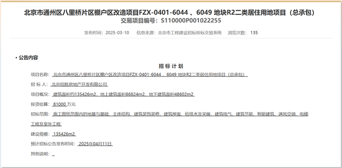 其实,早在3月10日,招商蛇口旗下北京招胜房地产开发有限公司发出了两条招标公告,为八里桥地块招标总承包和监理。