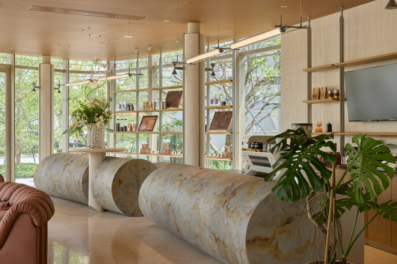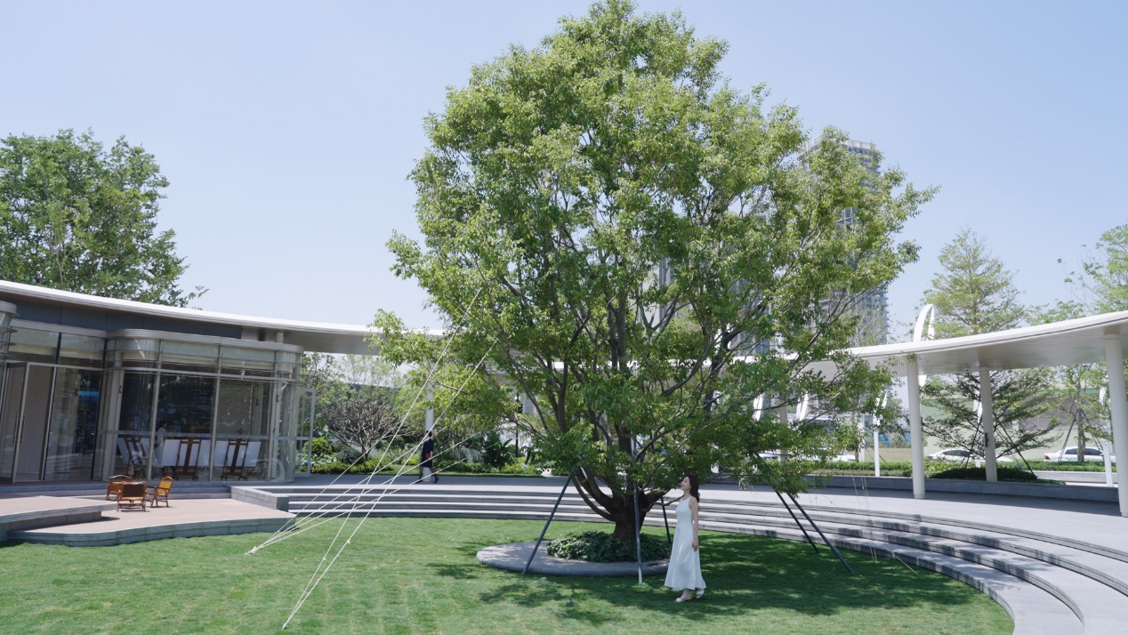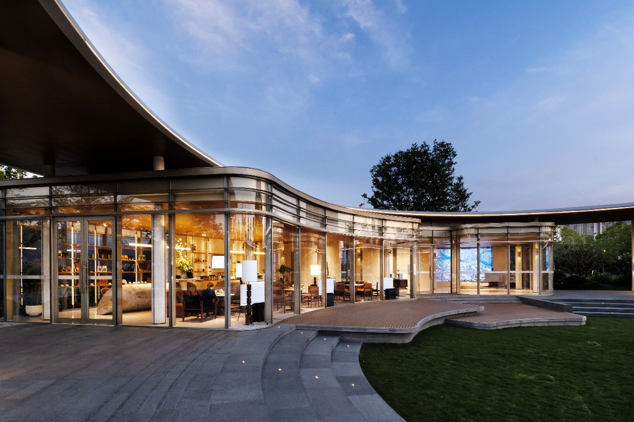 在传统地产开发中,售楼处往往是项目的第一触点。然而,招商蛇口却独辟蹊径,选择以咖啡馆的形式率先与市民见面。这一决策背后,是招商蛇口对“造生活比卖房子更重要”理念的深刻践行。【序咖啡馆】汲取东平江河流线的灵感,以"天圆地方"的环形顶棚和半弧形玻璃幕墙,打造出一座悬浮于水岸的"透明盒子"。弧形金属装饰线与曲面玻璃无缝交融,模糊了建筑与自然的界限——这与未来楼栋的外立面设计一脉相承,让客户提前感知社区的滨水生活美学。
