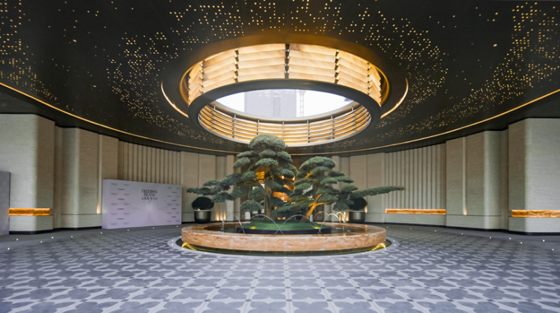 走入招商林屿缦岛的示范区,仿佛观看一部采用“一镜到底”拍摄手法的电影。从归家走廊的八棵石材卫士和六棵油橄榄树,到瀑布式跌水景观的下沉庭院,每一个场景都自然流畅地过渡。步履之间,以“一轴三院五境”为脉络,打造了一个充满仪式感的生活剧场。约3000㎡的运动主题会所、全龄段架空层、劳斯莱斯同款星空顶地库大堂,这些不只是豪华的布景,更是生活方式的载体。