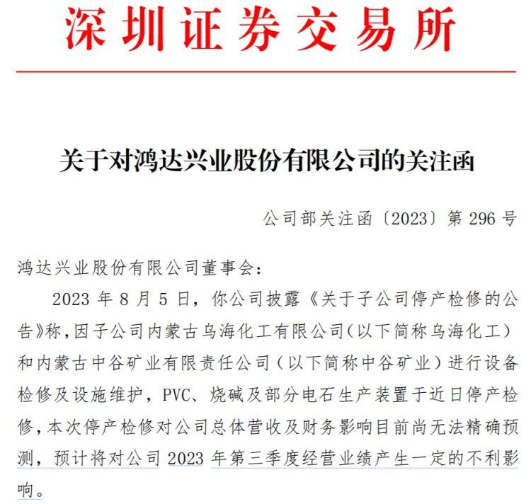 8月9日,深交所向鸿达兴业(002002)发出关注函,要求说明子公司停产检修对公司生产经营活动的影响程度和对公司收入、利润等相关财务数据的影响金额及占比,公司拟采取的保障生产经营稳定的具体措施等。