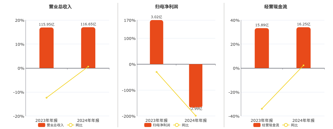 公司营业总收入为116.65亿元。归母净利润为-2.99亿元,在已披露的同业公司中排名第76,较去年同报告期归母净利润减少6.01亿元,同比较去年同期下降198.96%。经营活动现金净流入为16.25亿元。