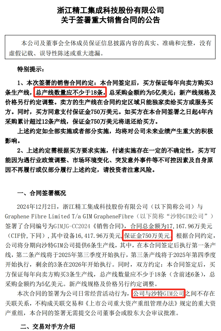 12月2日,精工科技公告称,公司与Graphene Fibre Limited T/a GIM GrapheneFibre(以下简称“沙特GIM公司”)签署了一份《销售合同》。