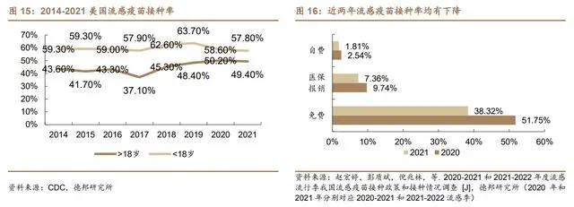 与发达国家相比,中国流感疫苗渗透率仍有较大的提升空间。根据中国预防医学杂志数据显示,2021年我国流感疫苗接种率仅为2.47%,其中免费接种政策人群接种率较高达到38.32%,医保报销政策人群接种率为7.36%,然而美国18岁以下儿童,疫苗接种率达57.8%,成人接种率达49.4%,我国流感疫苗接种率与美国相比仍有较大差距。