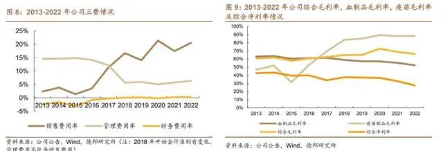 公司疫苗业务毛利率高于血制品毛利率,疫苗业务毛利率2013-2016年较低,主要受山东疫苗事件等行业黑天鹅事件影响,民众接种意愿下降,导致销量整体较少,2016年后毛利率开始逐步上升,2022年疫苗毛利率达到88.5%;近几年血制品毛利率近几年略有下降,主要是因为血浆成本上涨和疫情影响所致。