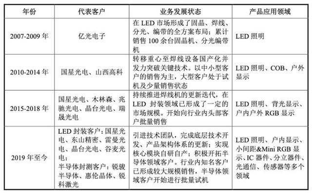 招股书提到,在LED领域,公司重点客户包括国星光电、东山精密、晶台光电等知名封装企业,并持续推进木林森、兆驰股份、雷曼光电等多家知名封装企业的批量销售。在半导体领域,公司涵盖了锐骏半导体、惠伦晶体、锐科激光、蓝彩电子、晶辉半导体等知名客户,并持续推进相关机型的批量销售。