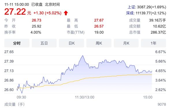 ▲大族激光 11日收报27.22元/股,总市值 286.37亿元